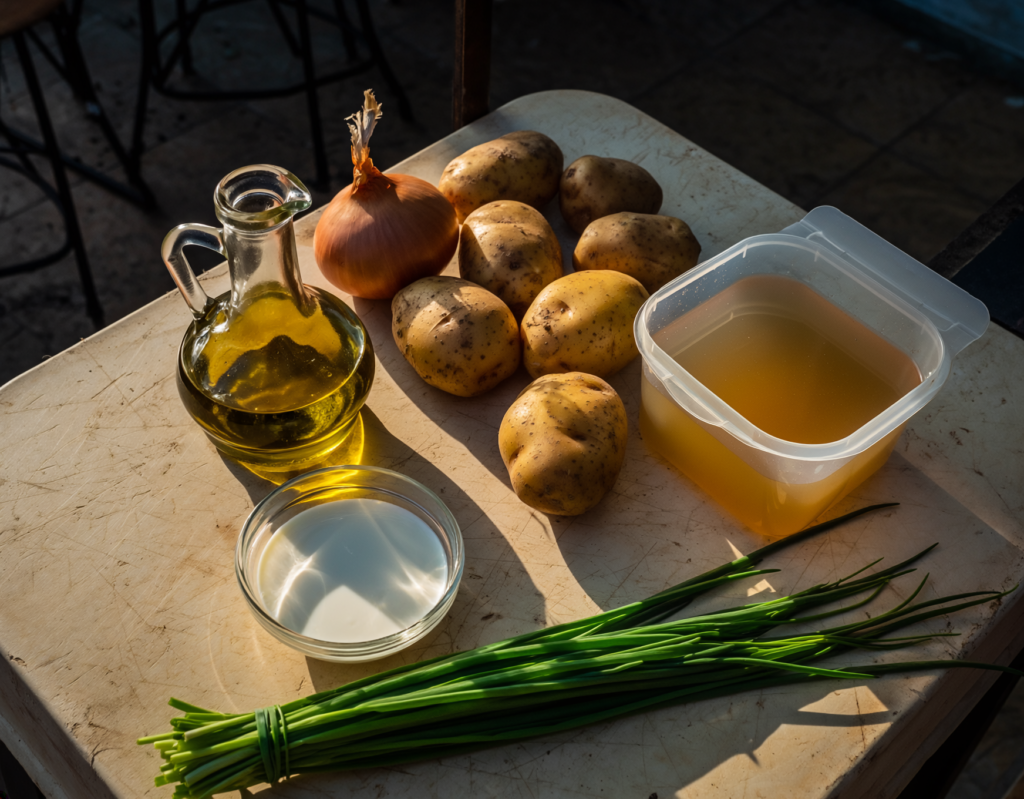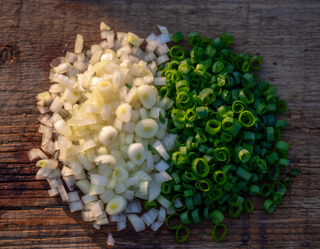 - Zwiebel schälen und würfeln. Kartoffeln schälen und in dünne Scheiben schneiden. Schnittlauch in feine Ringe schneiden.